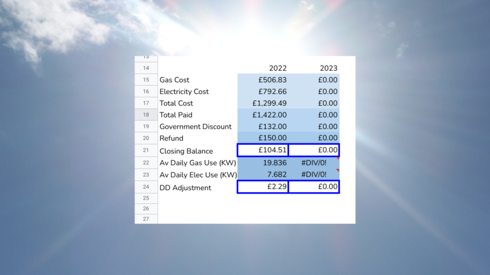 This sheet includes rows for gas and electricity. I'll be creating an electricity only one shortly. It also contains a row for the government discount that was handed out this year and the direct debit calculation doesn't include that, so it will work out what your direct debit should be when the discount is removed.